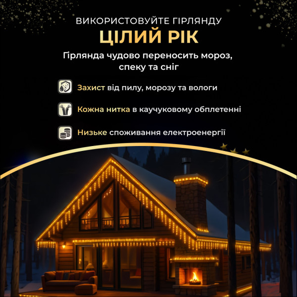 Гирлянда «Бахрома» с 335 LED лампочками создает атмосферное освещение для внешнего или внутреннего декора. Длина основного шнура составляет 20 метров, что позволяет украшать фасады домов, окна, балконы, беседки или витрины. Благодаря белой нити гирлянда незаметна днем и выглядит аккуратно при монтаже, а в темное время суток равномерно рассеивает свет, создавая праздничную иллюминацию.