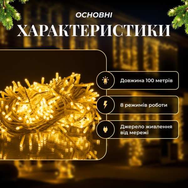 Уличная гирлянда Нить длиной 100 метров - универсальное решение для декорирования экстерьера. Устройство позволяет создать масштабное световое оформление достаточно больших территорий, фасадов и вывесок. Гирлянда предлагает 8 режимов свечения, что позволяет выбрать предпочтительные световые эффекты в зависимости от ситуации и настроения.
