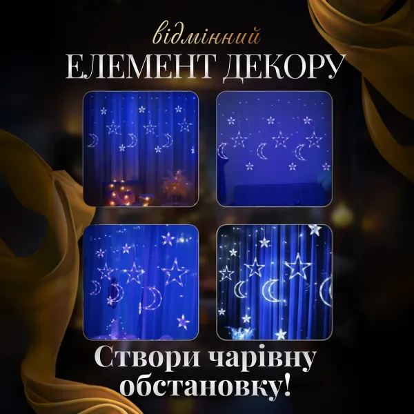 Двенадцать мерцающих фигур звезд создают волшебную атмосферу сказки и уюта. Гирлянду можно повесить на окно, чтобы создать праздничную атмосферу. Украсить ею стену или камин, чтобы добавить сияния. Также гирлянду можно использовать для декорирования елки или создать фотозону, чтобы запечатлеть воспоминания о празднике. Устройство представляет собой центральный провод, от которого отходят нити длиной 90, 80, 60, 33 см со сверкающими звездочками.
