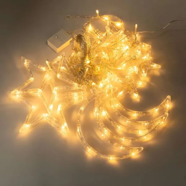 Двенадцать мерцающих фигур звезд создают волшебную атмосферу сказки и уюта. Гирлянду можно повесить на окно, чтобы создать праздничную атмосферу. Украсить ею стену или камин, чтобы добавить сияния. Также гирлянду можно использовать для декорирования елки или создать фотозону, чтобы запечатлеть воспоминания о празднике. Устройство представляет собой центральный провод, от которого отходят нити длиной 90, 80, 60, 33 см со сверкающими звездочками.