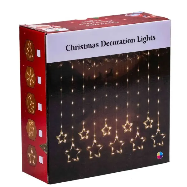 Десять белых фигур звезд и мерцающих елок создают сказочную атмосферу. Размер 3*0,9 м делает эту гирлянду идеальной для окон, дверей, стен и других поверхностей. Светодиоды потребляют мало энергии, поэтому можно наслаждаться сиянием гирлянды без ущерба для бюджета. Гирлянда имеет низкое напряжение, что делает ее безопасной для использования в помещении.