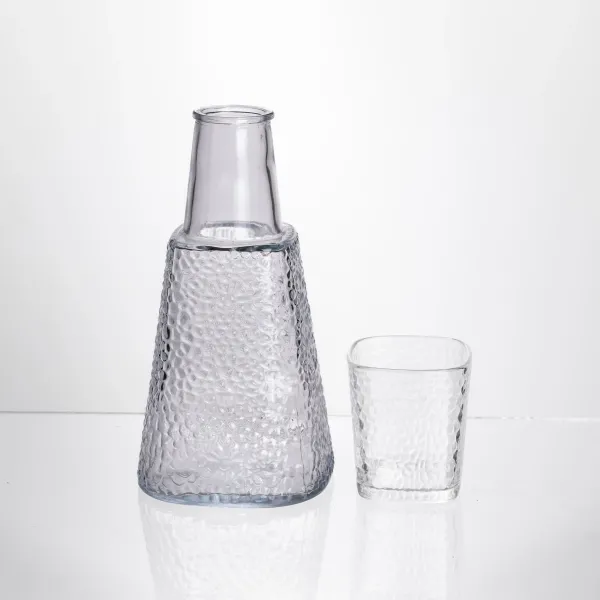 Карафе со стаканом из стекла — стильный и практичный набор для воды и напитков. Прозрачный графин с фактурными гранями удобно держать в руке, а стакан служит не только посудой для питья, но и крышкой, надежно защищающей содержимое. Посуда выполнена из стекла с выразительной молоточковой текстурой, которая не только придаёт изделию декоративный объём, но и красиво преломляет свет. Кроме того, такая поверхность гораздо менее маркая: она эффективно скрывает отпечатки пальцев и следы от капель, сохраняя аккуратный вид даже при активном использовании.