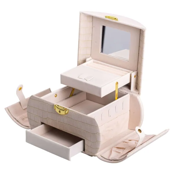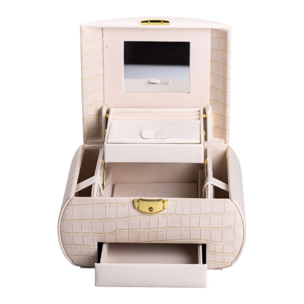 Органайзер дополнен зеркалом в крышке, что делает его использование еще более удобным. Шкатулка плотно закрывается, крышка дополнительно оснащена защелкой, а боковые стенки фиксируются кнопками.