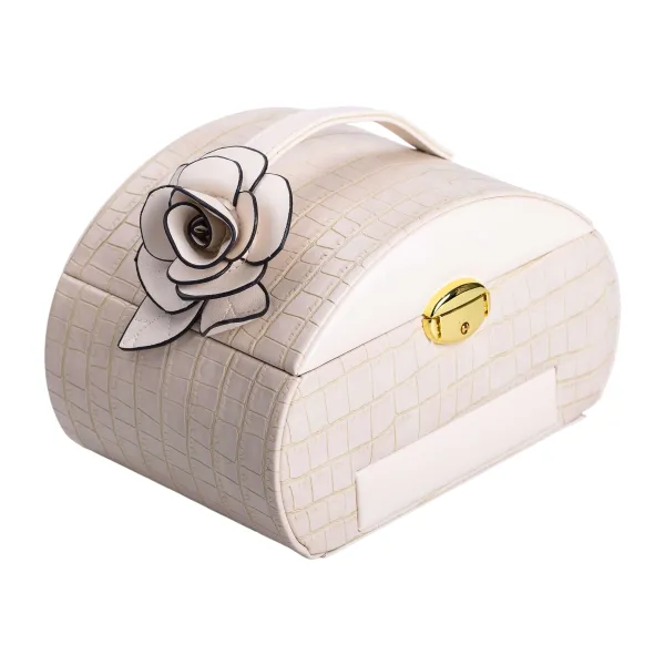 Оригинальный кейс-органайзер для украшений размером 24х17х18 см, выполненный в виде небольшого саквояжика - стильное решение не только для хранения аксессуаров, на туалетном столике, но и как вариант для транспортировки украшений на выставки и презентации. Шкатулка имеет 6 отсеков, благодаря чему можно удобно разместить кольца, браслеты, серьги, цепочки различного размера. Внутренняя отделка выполнена из велюра и отлично подходит для жемчуга, камней, драгоценных металлов и бижутерии.