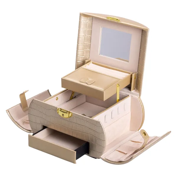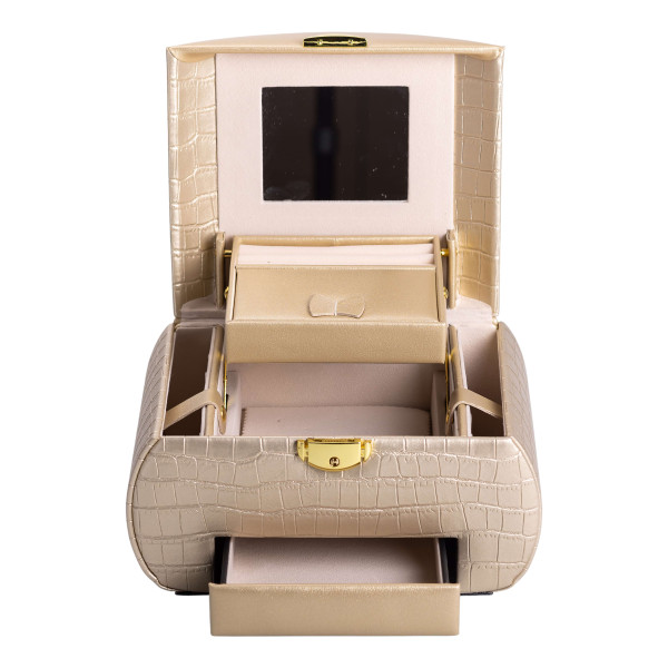 Органайзер дополнен зеркалом в крышке, что делает его использование еще более удобным. Шкатулка плотно закрывается, крышка дополнительно оснащена защелкой, а боковые стенки фиксируются кнопками.