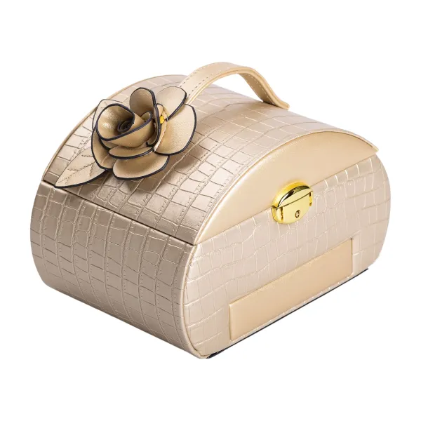 Шкатулка отличается жестким корпусом, защищающим содержимое от внешних воздействий. Внешнее покрытие выполнено из экокожи с тиснением, элементы фурнитуры изготовлены из стали с гальваническим покрытием.