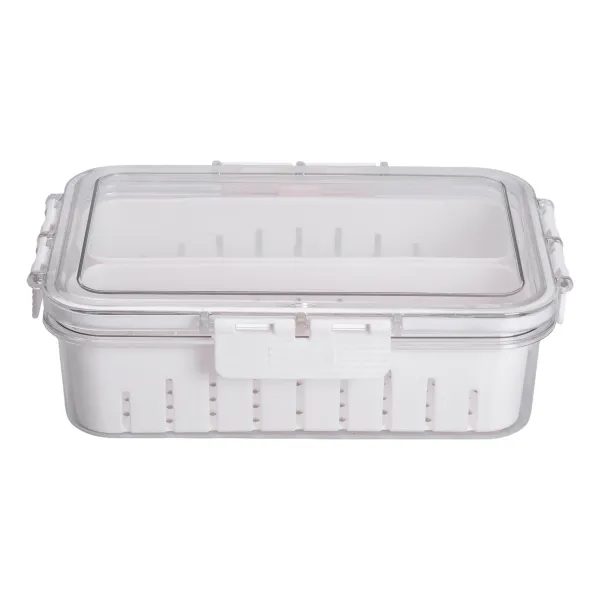Раздельные секции позволяют хранить различные продукты одновременно, не смешивая их между собой. Благодаря решетчатой основе продукты не лежат в воде, что положительно влияет на срок их свежести. Такая конструкция идеально подходит для холодильного хранения предварительно вымытых ягод, листовой зелени, порезанных овощей или фруктов.