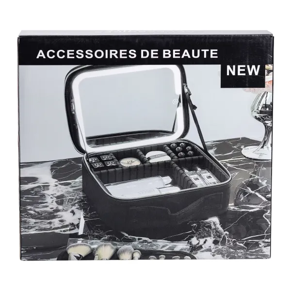 Кейс оснащен надежной застежкой, предотвращающей случайное открывание во время транспортировки. Фиксация зеркала на крышке осуществляется с помощью липучек. Его внешняя поверхность легко очищается, что обеспечивает сохранение эстетического вида. Благодаря сочетанию функциональности и стильного дизайна кейс является практичным решением для хранения косметики дома или в дороге.