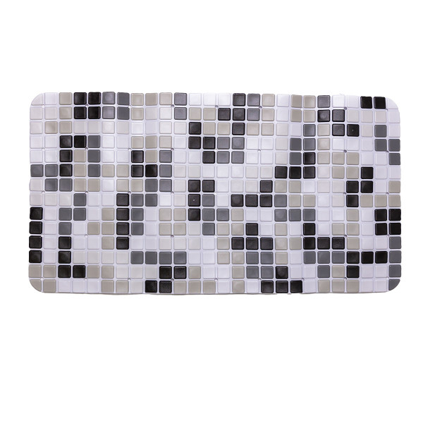 Узор выполнен в стиле мозаики из мелких квадратных элементов, формирующих аккуратную и упорядоченную поверхность. Равномерно распределенные отверстия выполняют функцию дренажа и способствуют лучшему сцеплению, предотвращая скопление воды. Такая структура повышает комфорт при использовании и делает коврик практичным в ежедневном уходе.