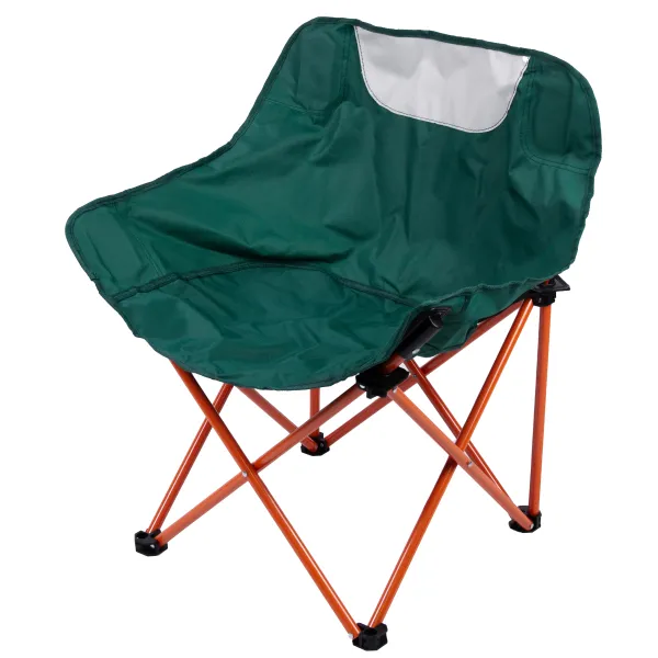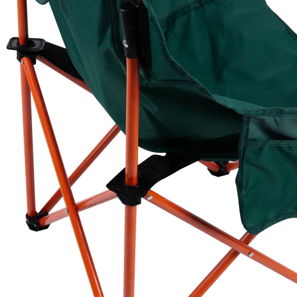 Складное кемпинговое кресло имеет металлический каркас, который обеспечивает прочность и устойчивость. Механизм складывания позволяет легко и быстро собрать и разобрать кресло, что делает его удобным для транспортировки и хранения.