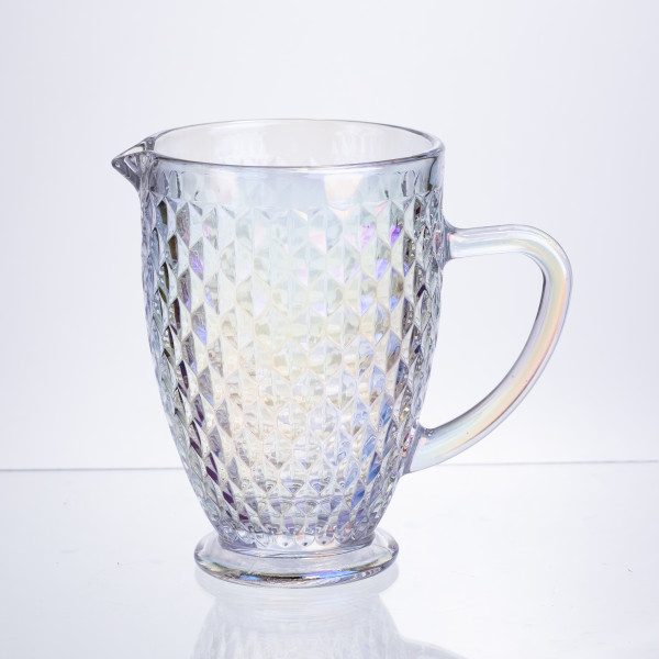 Кувшин для напитков объемом 1,2 л изготовлен из толстого стекла. Он имеет декоративную поверхность с рельефными изгибами в форме ромбов. Такой дизайн добавляет визуального объема и способствует игре света на стекле, что особенно заметно при сервировке напитков. Прозрачное стекло позволяет видеть содержимое, а толстые стенки обеспечивают прочность.