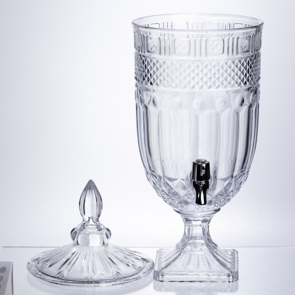 Массивный диспенсер для подачи прохладительных напитков на больших мероприятиях. Благодаря классическому рельефному узору и объему, он становится центральным элементом сервировки, объединяя в себе эстетику антикварного стекла и современную практичность.