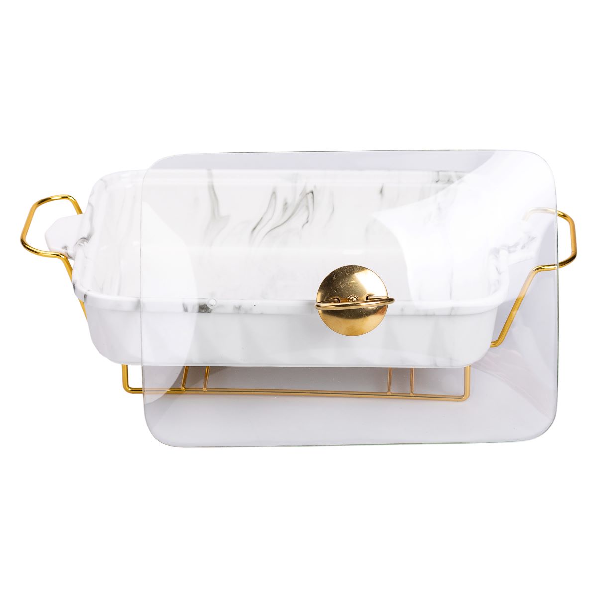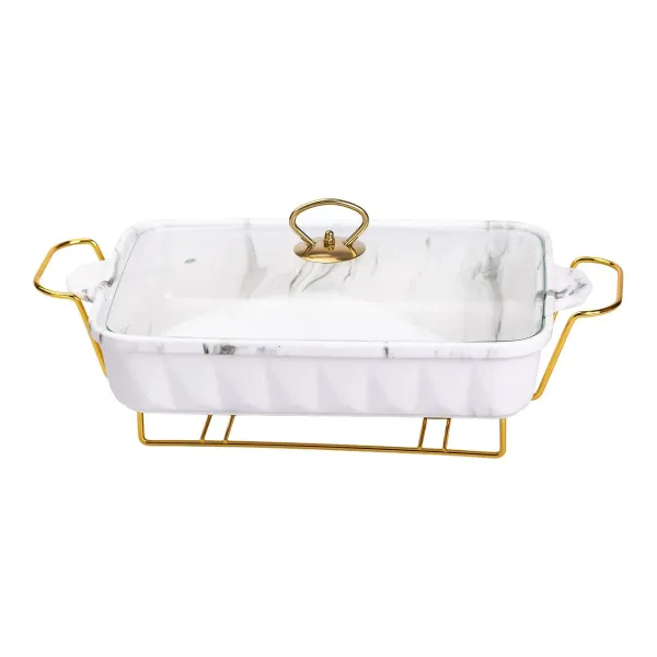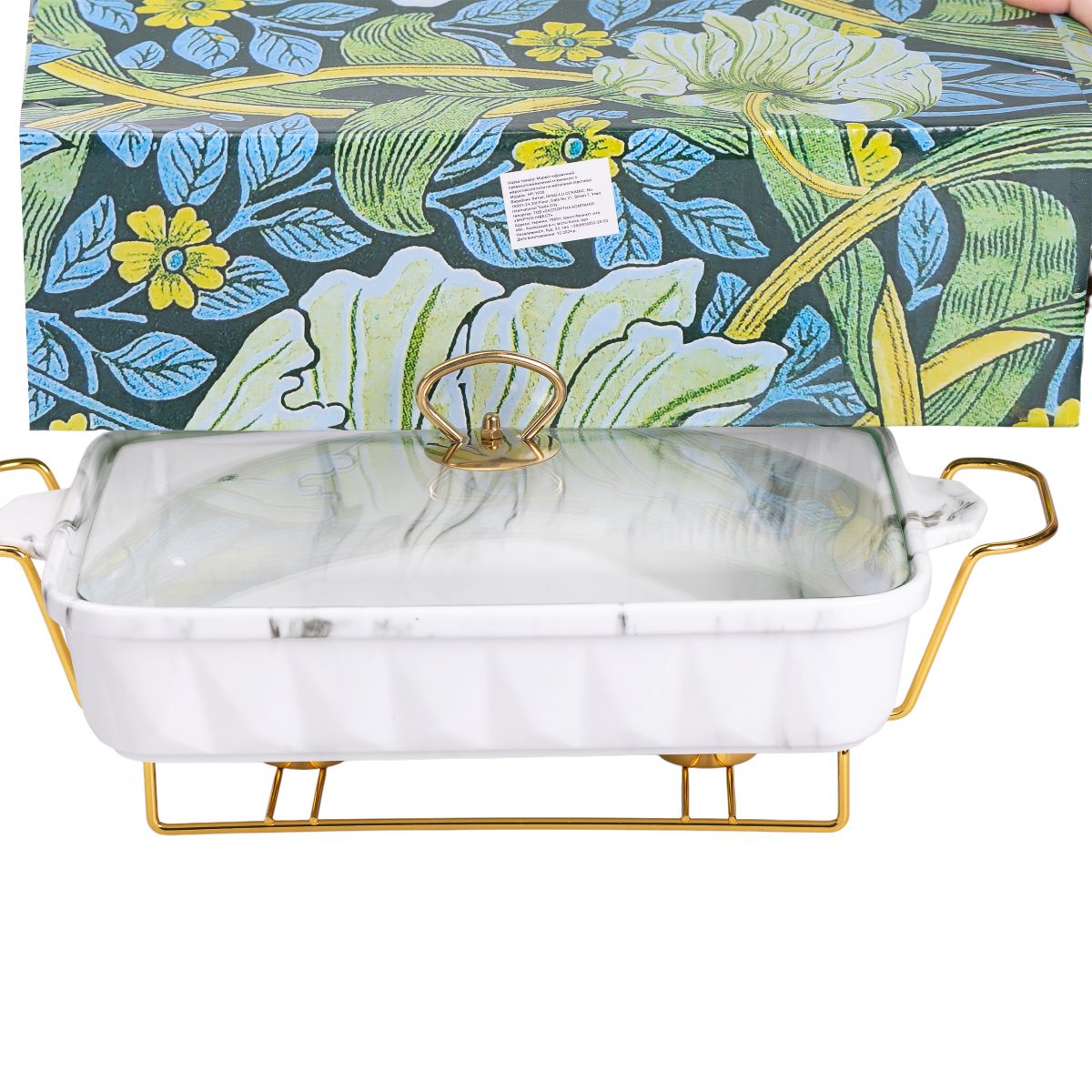 Металлическая подставка обеспечивает устойчивость мармитницы на столе и позволяет использовать подогрев с помощью свечи. Это особенно удобно во время застолий, когда нужно долго сохранять блюда теплыми. Стеклянная крышка помогает сохранять температуру и защищает пищу от внешних воздействий. Габариты изделия - 40×22,5×15,5 см, что оптимально подходит для подачи средних и больших порций.