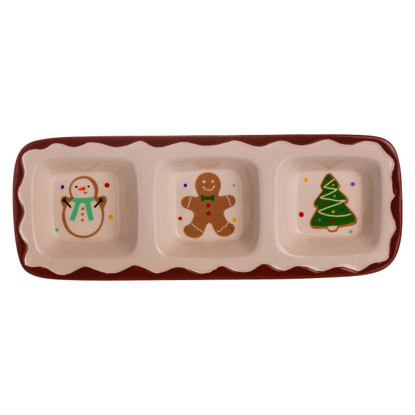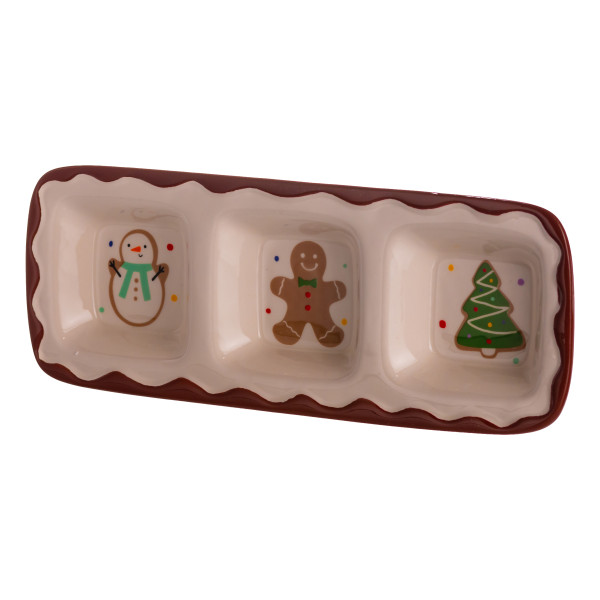 Менажница фарфоровая Merry Christmas — это удобный и декоративный элемент праздничной сервировки. Она имеет три отдельных секции, каждая из которых украшена ярким новогодним рисунком: снеговиком, пряником и елкой. Благодаря сочетанию праздничных цветов и глянцевой поверхности изделие создает уютную атмосферу и добавляет настроения во время рождественских застолий.