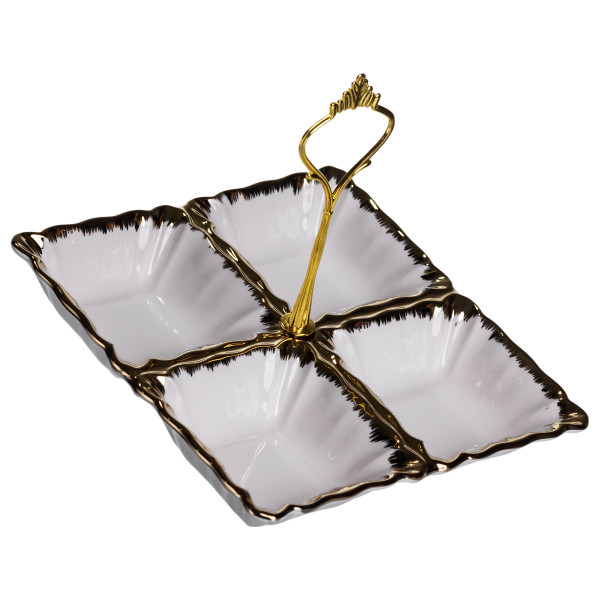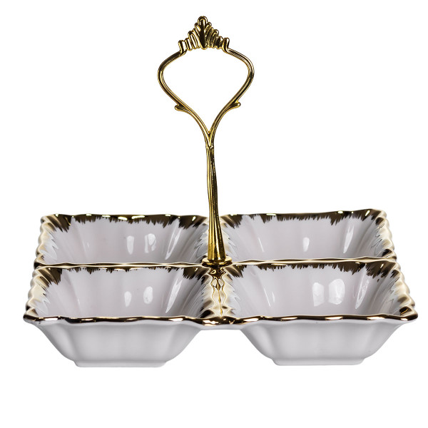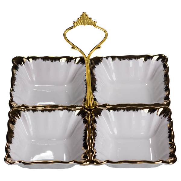 Фарфоровая менаженица на четыре секции предназначена для подачи закусок, соусов, орешков или десертов. Изделие имеет квадратную форму с четким разделением на отдельные отделения, что позволяет сервировать несколько разных блюд одновременно без смешивания вкусов. Центральная ручка облегчает перенос и добавляет удобства при использовании.