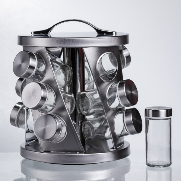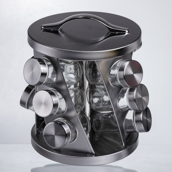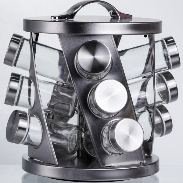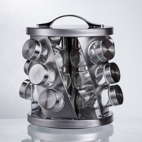 Эта карусель для специй сочетает современный дизайн и удобство использования. В комплект входят 12 стеклянных баночек объёмом 100 мл каждая с плотными металлическими крышками — идеально подходят для хранения специй, приправ, сухих трав и семян. Подставка выполнена из металла с брашированной поверхностью, что придаёт комплекту элегантный внешний вид и долговечность. Брашированная поверхность особенно удобна в домашних условиях, если на кухне есть маленькие дети или частые прикосновения — следы менее заметны, чем на глянце.