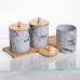 Набор банок для хранения чая, кофе и сахара. Три отдельных емкости с мраморным узором имеют четкую маркировку, что позволяет быстро находить нужный ингредиент. Компактное размещение на бамбуковой подставке помогает сэкономить место на рабочей поверхности, сохраняя порядок и доступность.
