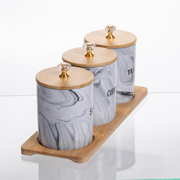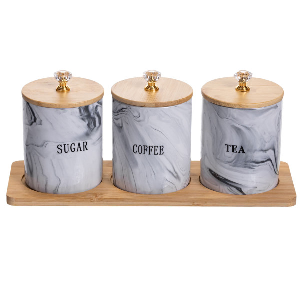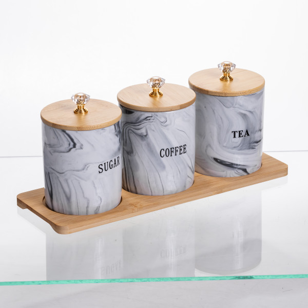Набор банок для хранения чая, кофе и сахара. Три отдельных емкости с мраморным узором имеют четкую маркировку, что позволяет быстро находить нужный ингредиент. Компактное размещение на бамбуковой подставке помогает сэкономить место на рабочей поверхности, сохраняя порядок и доступность.