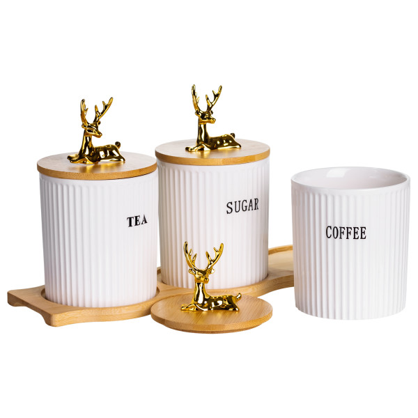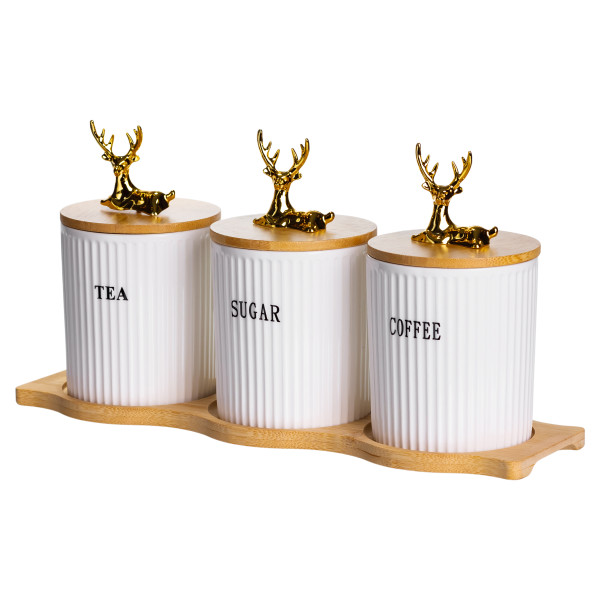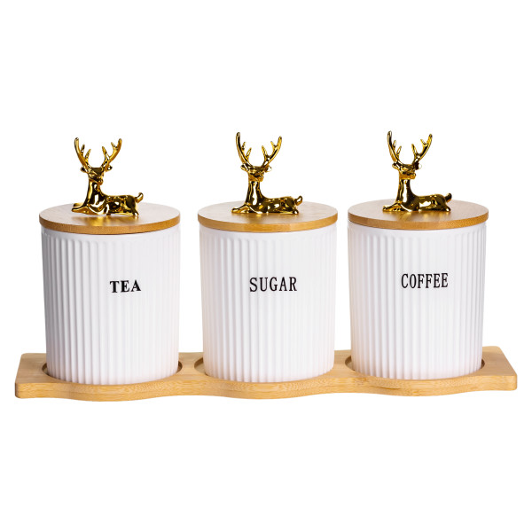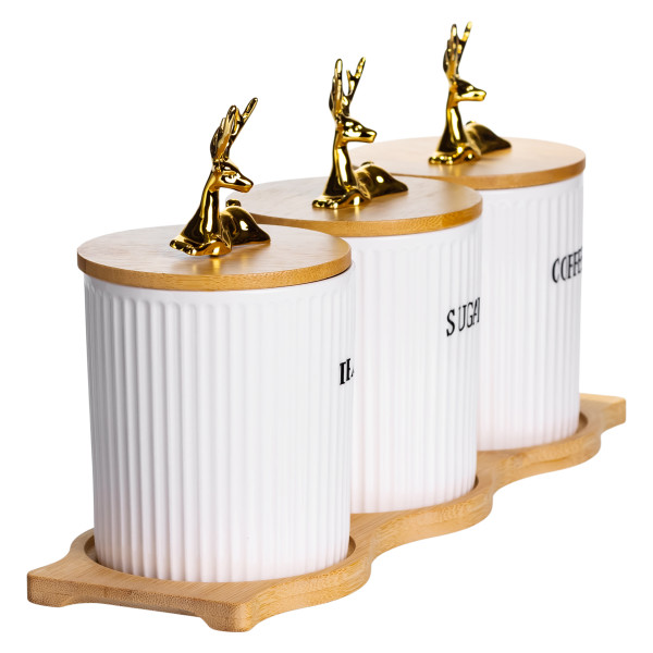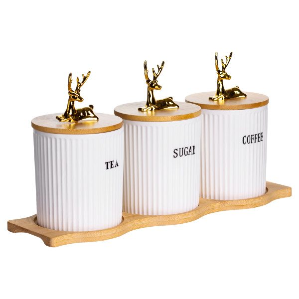 Крышки изготовлены из бамбука, дополнены декоративными фигурками в виде золотых оленей. Они плотно прилегают к банкам, защищая содержимое от влаги и посторонних запахов. Объем каждой емкости — 400 мл, что оптимально подходит для ежедневного использования. Благодаря высоте 10 см и диаметру 9 см банки легко размещаются на полках или в шкафу.