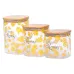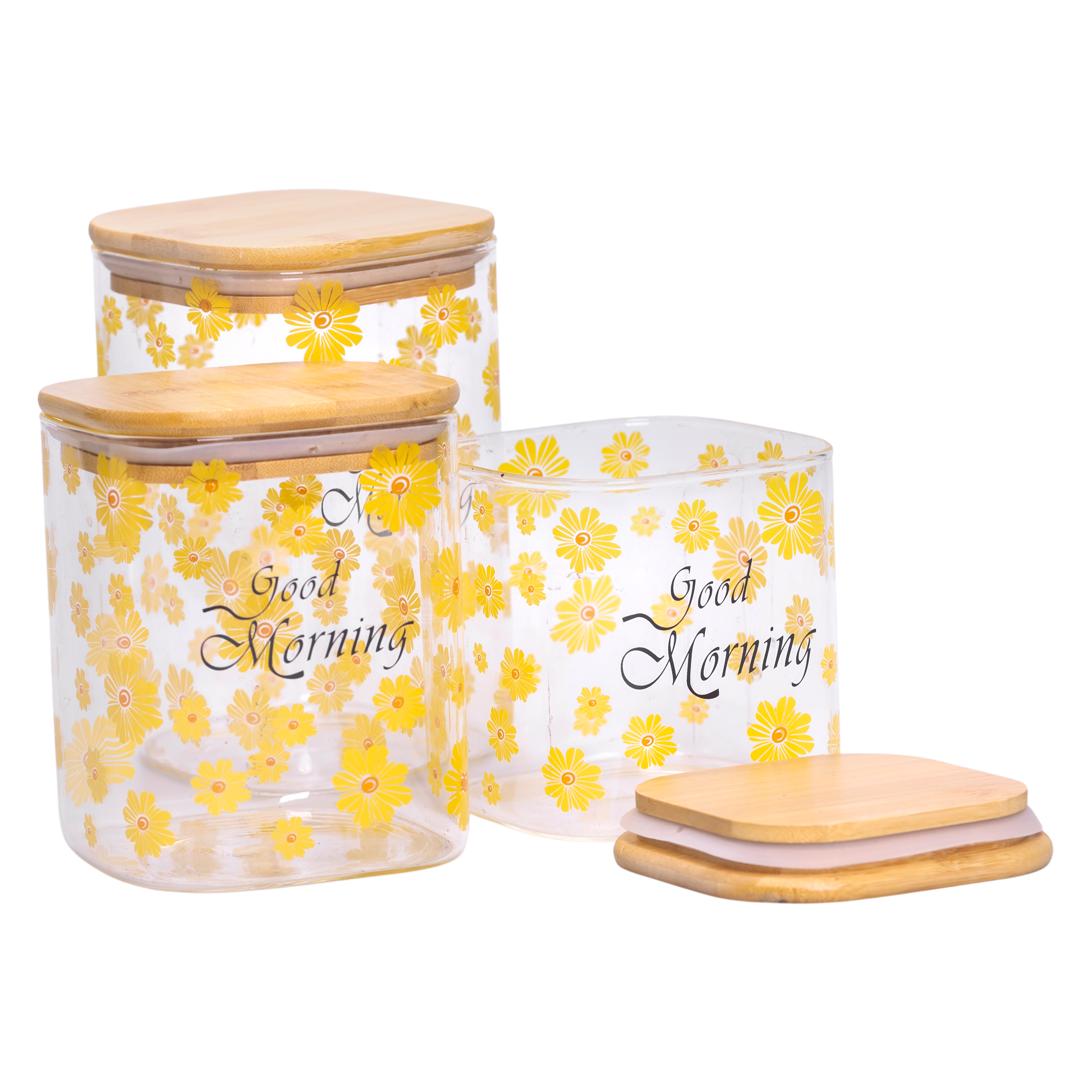 Крышки изготовлены из бамбука и оснащены силиконовым уплотнителем, который обеспечивает герметичность и сохраняет продукты свежими в течение длительного времени. Дизайн банок украшен яркими желтыми цветами и надписью Good Morning, что придает кухне приятную атмосферу и создает уютное настроение.