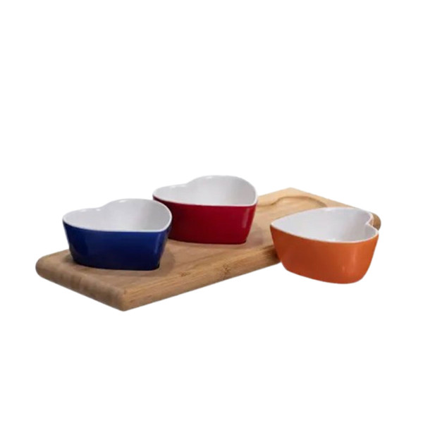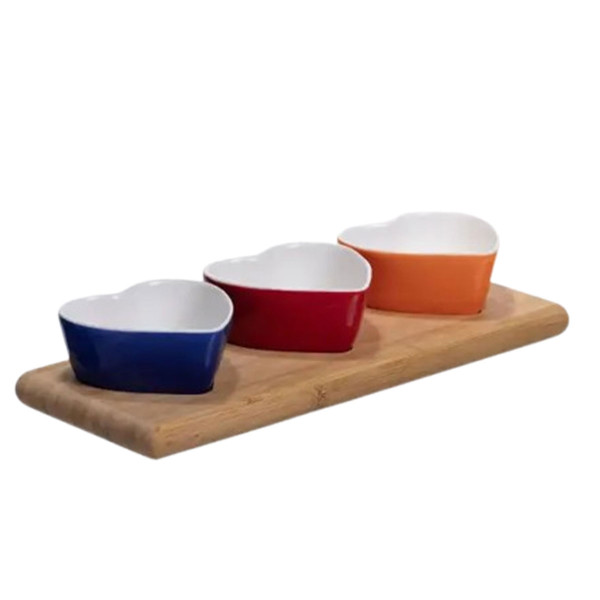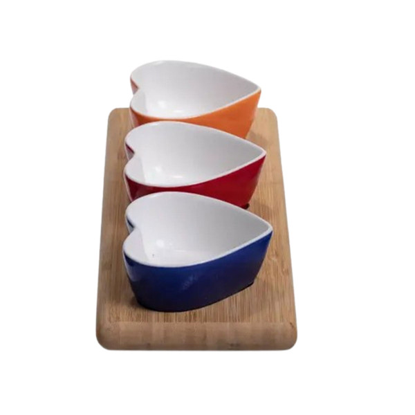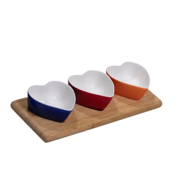 Набор состоит из трех фарфоровых менажниц объемом по 100 мл, размещенных на прямоугольной бамбуковой подставке размером 28 × 11 см. Каждая менажница имеет диаметр 8 см и одинаковую форму — сердцевидную. Такой формат подходит для подачи соусов, специй, мелких закусок или десертных порций.