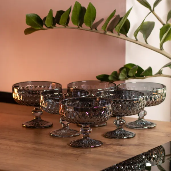 Простой дизайн облегчает сочетание креманок с другой посудой. Они легко моются и не теряют прозрачности со временем. Набор из 6 штук подходит как для быта, так и для небольших заведений питания.