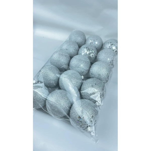 Набор новогодних шаров на елку 15 штук, 6 см, блеск, серебряный — это базовое решение для оформления праздничного интерьера. Серебристый цвет с блестками и звездочками создает отблески под светом гирлянд, что добавляет декоративный эффект. Такая цветовая гамма хорошо сочетается как с холодными, так и с теплыми оттенками других украшений.