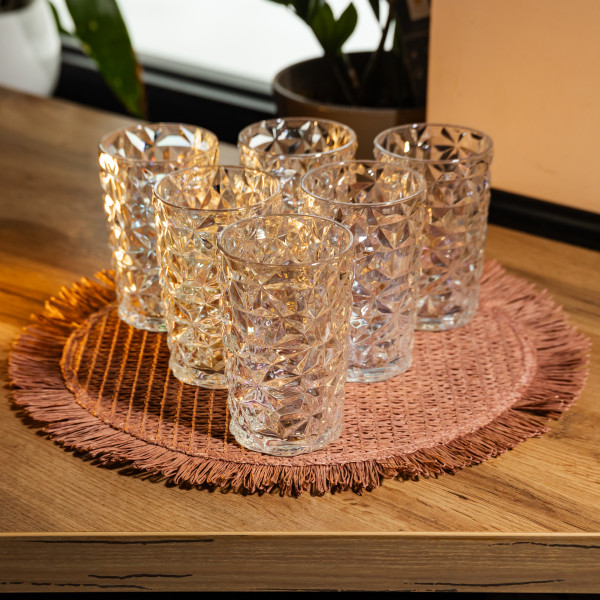Элегантный набор стаканов объёмом 350 мл с фактурным геометрическим рисунком идеально подходит для воды, соков, безалкогольных и холодных коктейлей — сочетает практичность и декоративный блеск.