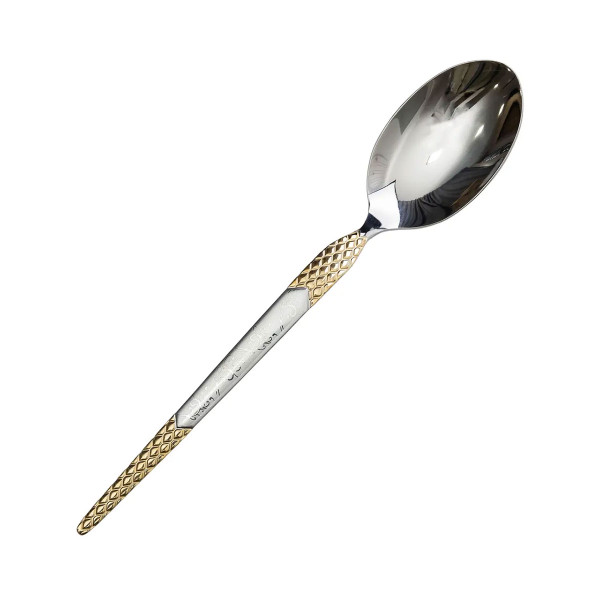 Набор столовых ложек из нержавеющей стали предназначен для повседневного использования дома или в заведениях питания. Классическая форма сочетается с декоративными золотистыми вставками на ручках, что создает сдержанный и одновременно аккуратный вид. Зеркальная полировка поверхности придает ложкам привлекательность и облегчает уход.