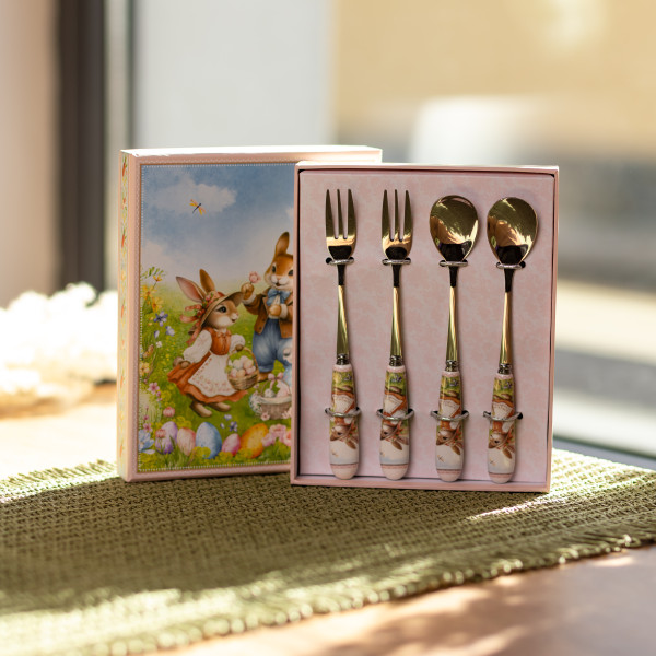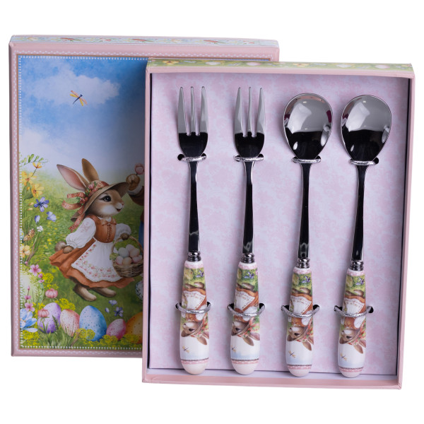 Рабочая часть приборов изготовлена из нержавеющей стали с глянцевым покрытием, что обеспечивает аккуратный вид и удобство использования. Фарфоровые ручки продуманы для комфортного удержания и декорированы изображениями кроликов, которые гармонично сочетаются с десертной подачей и тематической посудой.