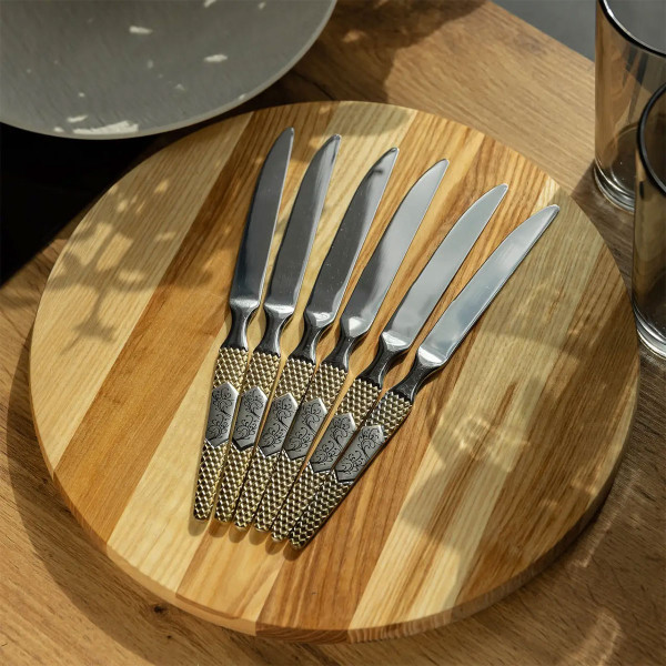 Изготовлены из нержавеющей стали, ножи устойчивы к коррозии, сохраняют внешний вид при регулярной мойке и не требуют особого ухода. Серебристое покрытие придает им аккуратный вид, а золотистая отделка ручек и изящная гравировка делают каждый нож изысканным акцентом сервировки.