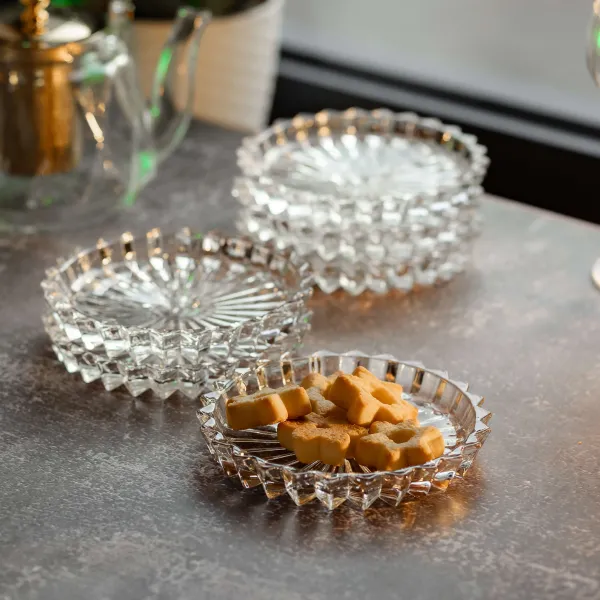 Благодаря прозрачной структуре стекла, блюдца гармонично сочетаются с различными стилями сервировки. Компактные размеры позволяют легко размещать их на столе, а гладкая поверхность способствует удобному уходу. Подходят для ежедневного использования и праздничных мероприятий.