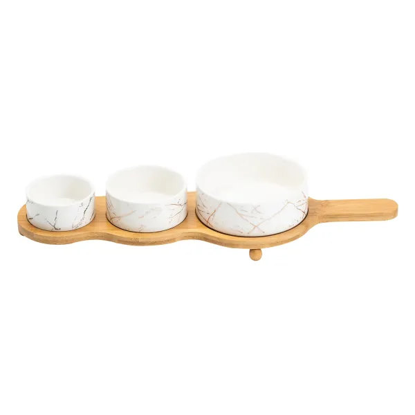 Набор для закусок из трех фарфоровых менажниц объемом 0,25 л, 0,15 л и 0,1 л, расположенных на бамбуковой подставке, является идеальным дополнением к любой сервировке. Менажницы выполнены в элегантном белом цвете с эффектом, имитирующим мрамор, придавая им изящный и современный вид.