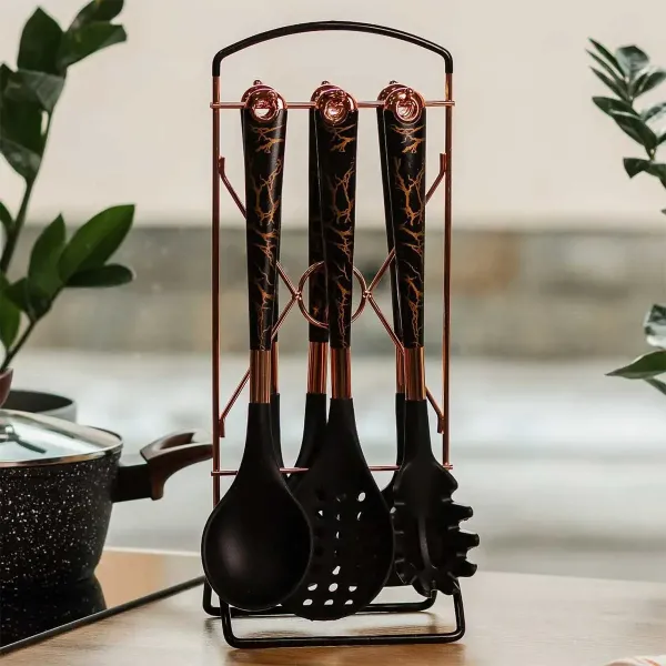 Кроме того, в комплект входит удобная подставка для хранения, что обеспечивает порядок и легкий доступ к необходимым инструментам. Этот элегантный и функциональный набор сделает вашу кухню стильной и организованной.