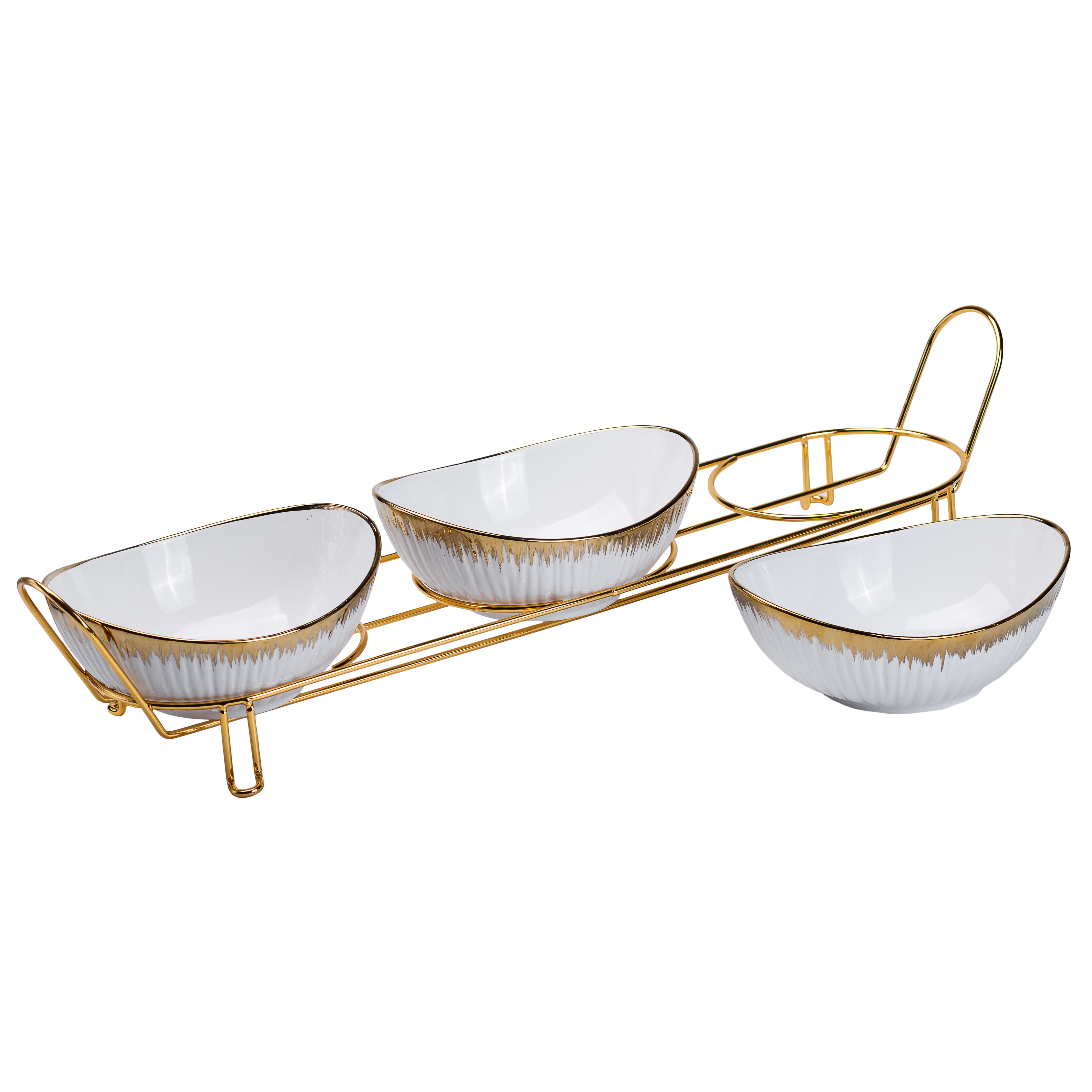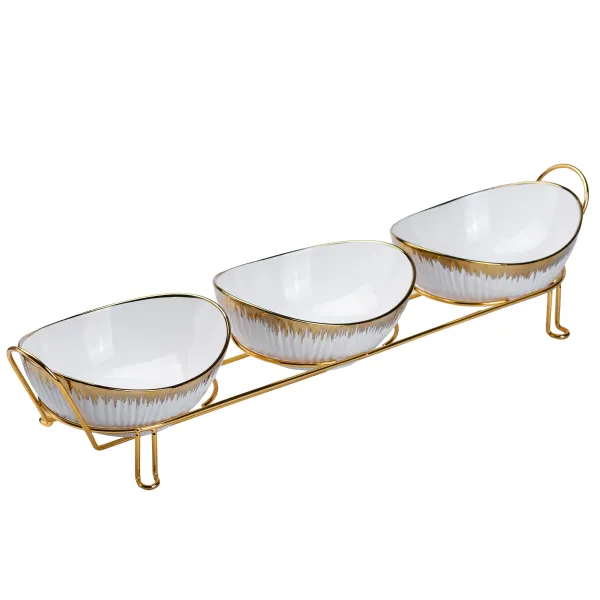 Добавьте элегантности и функциональности вашему столу с этим изысканным набором менажниц. Набор включает три фарфоровые менажницы, установленные на стильной металлической подставке, что обеспечивает удобное и эффектное представление закусок, десертов, фруктов и других блюд на вашем столе.