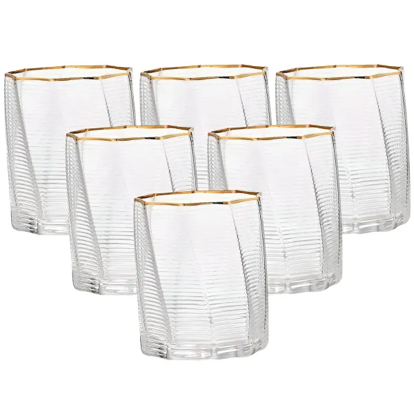 Набор стаканов 3-D print - это воплощение современного дизайна и элегантности. Каждый стакан имеет емкость 300 мл, что делает их идеальными для подачи любимых напитков, таких как соки, коктейли или воды. Прозрачное стекло подчеркивает цвета напитков, а золотой ободок придает стаканам роскошный вид, что придаст вашему столу особый шарм. Уникальная 3-D текстура делает каждый стакан не только практичным, но и стильным акцентом на любом столе.