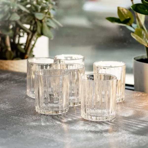Набор стаканов состоит из шести одинаковых изделий, изготовленных из толстого стекла. Благодаря этому материалу стаканы обладают повышенной прочностью и хорошо выдерживают температурные перепады. Прозрачная поверхность позволяет удобно контролировать уровень напитка, а классический дизайн подходит для ежедневного использования.