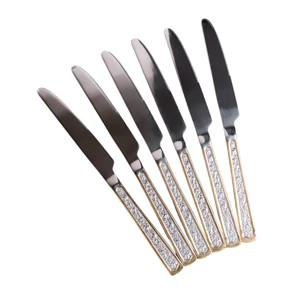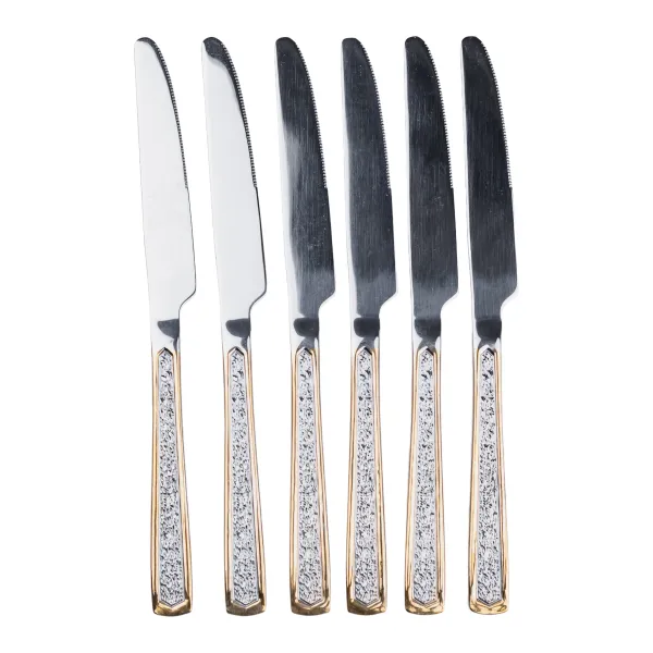 Набор столовых ножей из 6 штук с фактурой, хром с золотом — это элегантный и современный набор столовых приборов, который идеально подойдет для любого случая. Ножи изготовлены из высококачественной нержавеющей стали с хромовым и золотым покрытием, что делает их прочными и устойчивыми к ржавчине. Они также имеют фактурную отделку, которая добавляет нотку элегантности. Ножи безопасны для мытья в посудомоечной машине, что облегчает очистку.