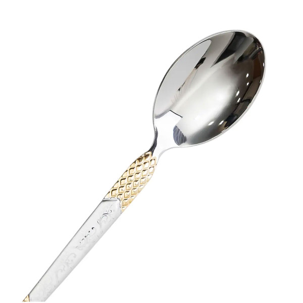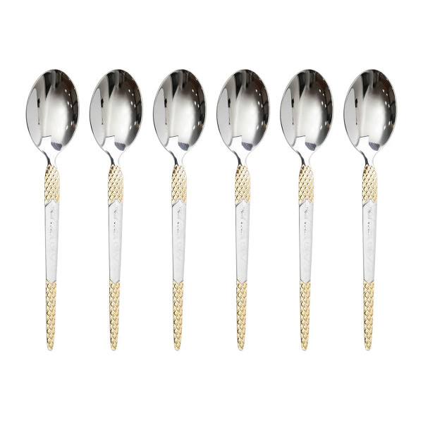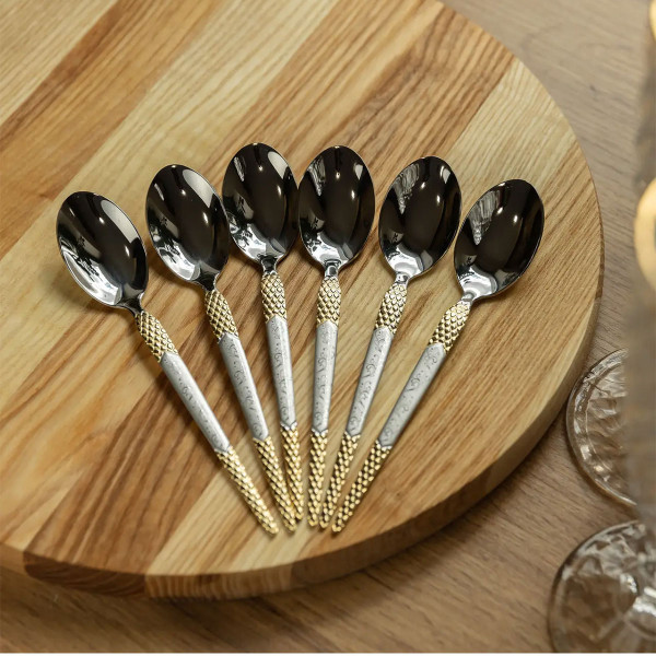 Набор чайных ложек из нержавеющей стали создан для удобства при ежедневном использовании. Благодаря классической форме и зеркальной полировке ложки выглядят аккуратно и гармонично сочетаются с любой посудой. Декоративные вставки золотистого цвета на ручках добавляют элегантности, а сбалансированный вес обеспечивает комфорт в использовании.