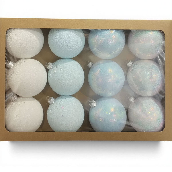 Набор новогодних шаров "Микс" — 12 штук, 8 см, блеск + глянец, белый/голубой — это комбинированный комплект для декора елки в холодной цветовой гамме. В наборе 6 белых и 6 голубых шаров, что позволяет создать гармоничное оформление без лишней пестроты. Шары имеют два типа покрытия — 6 с блестками и 6 с глянцевой поверхностью.