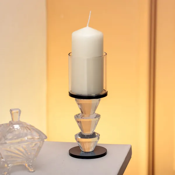 Подсвечник декоративный Parallels изготовлен из стекла и имеет современный геометрический дизайн. Благодаря прозрачным стенкам и темным акцентам конструкция выглядит лаконично и сдержанно. Прямая форма верхней части и круглое основание, дополненное коническим элементом, создают визуальный баланс и добавляют стабильности изделию.