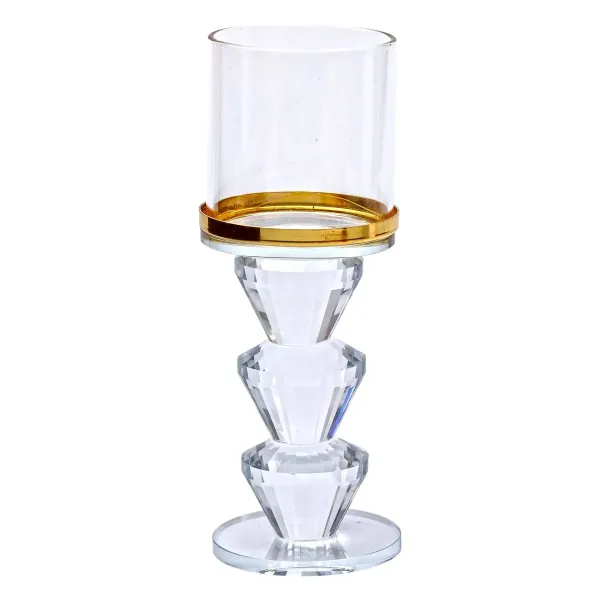Подсвечник декоративный YIMI изготовлен из стекла и имеет простую цилиндрическую форму с акцентом в виде золотистого кольца. Этот элемент выделяет изделие среди других стеклянных подсвечников и добавляет визуальной выразительности. Прозрачное стекло в сочетании с геометрической основой создает равновесие между классическим и современным дизайном.