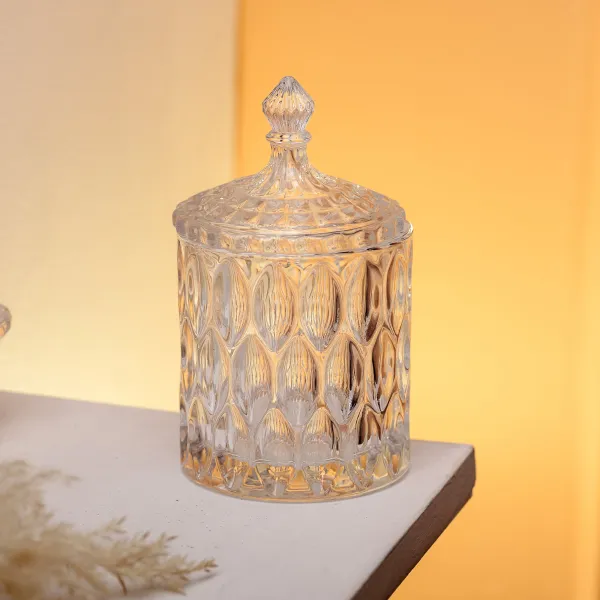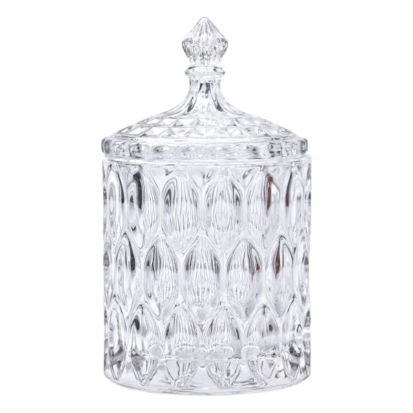 Конфетница с крышкой из стекла - удобный аксессуар для хранения сахара и сыпучих продуктов. Выполненная в цилиндрической форме, она имеет диаметр 7,5 см и высоту 15 см вместе с крышкой, что позволяет компактно размещать ее на кухонном столе или в серванте. Благодаря прозрачному стеклу содержимое остается хорошо видимым, а грани создают эффект переливания света.
