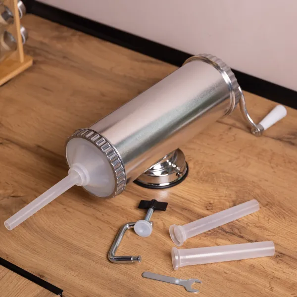 Шприц колбасный на 2 кг - идеальный инструмент и помощник в процессе наполнения оболочек колбасным фаршем. Шприц имеет простой принцип работы, ручной привод оборудован удобной ручкой. Вакуумный принцип крепления позволяет надежно зафиксировать шприц на рабочей поверхности, в комплекте есть дополнительная струбцина.