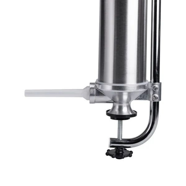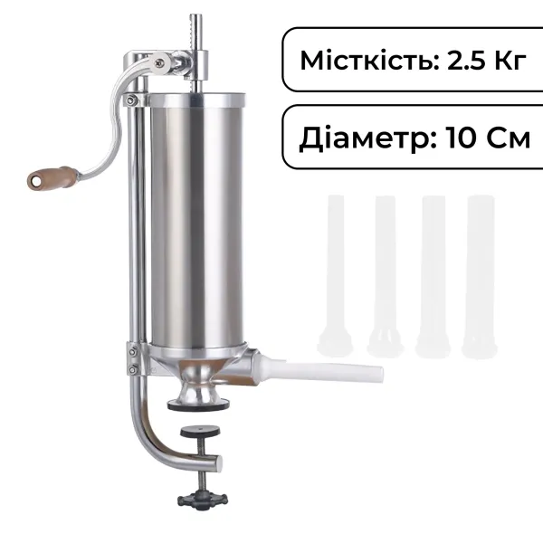 Шприц колбасный вертикальный на 2,5 кг - идеальный инструмент и помощник в изготовлении колбасных изделий. Шприц имеет простой принцип работы, ручной привод оборудован удобной ручкой. Фиксация шприца на рабочей поверхности осуществляется с помощью струбцины.