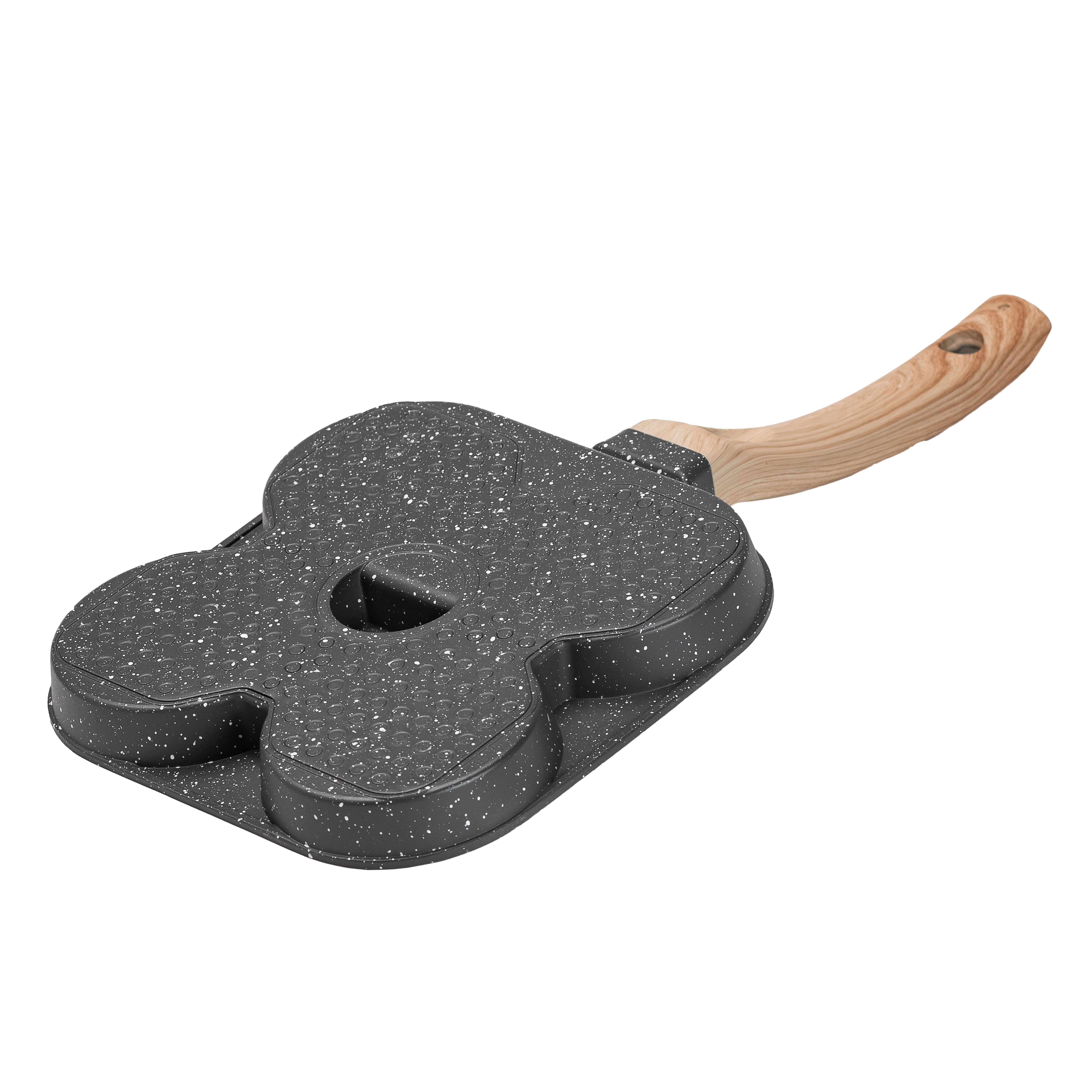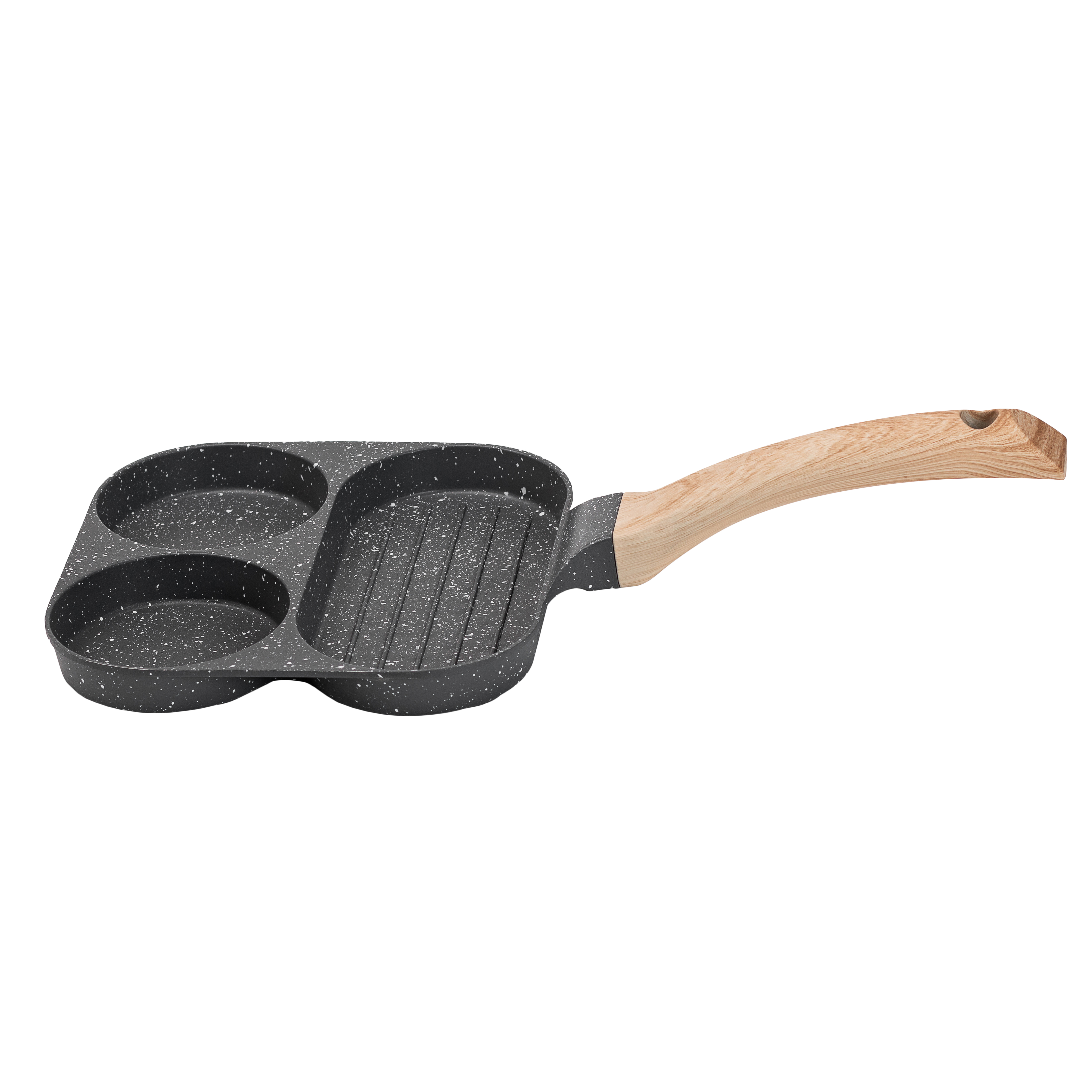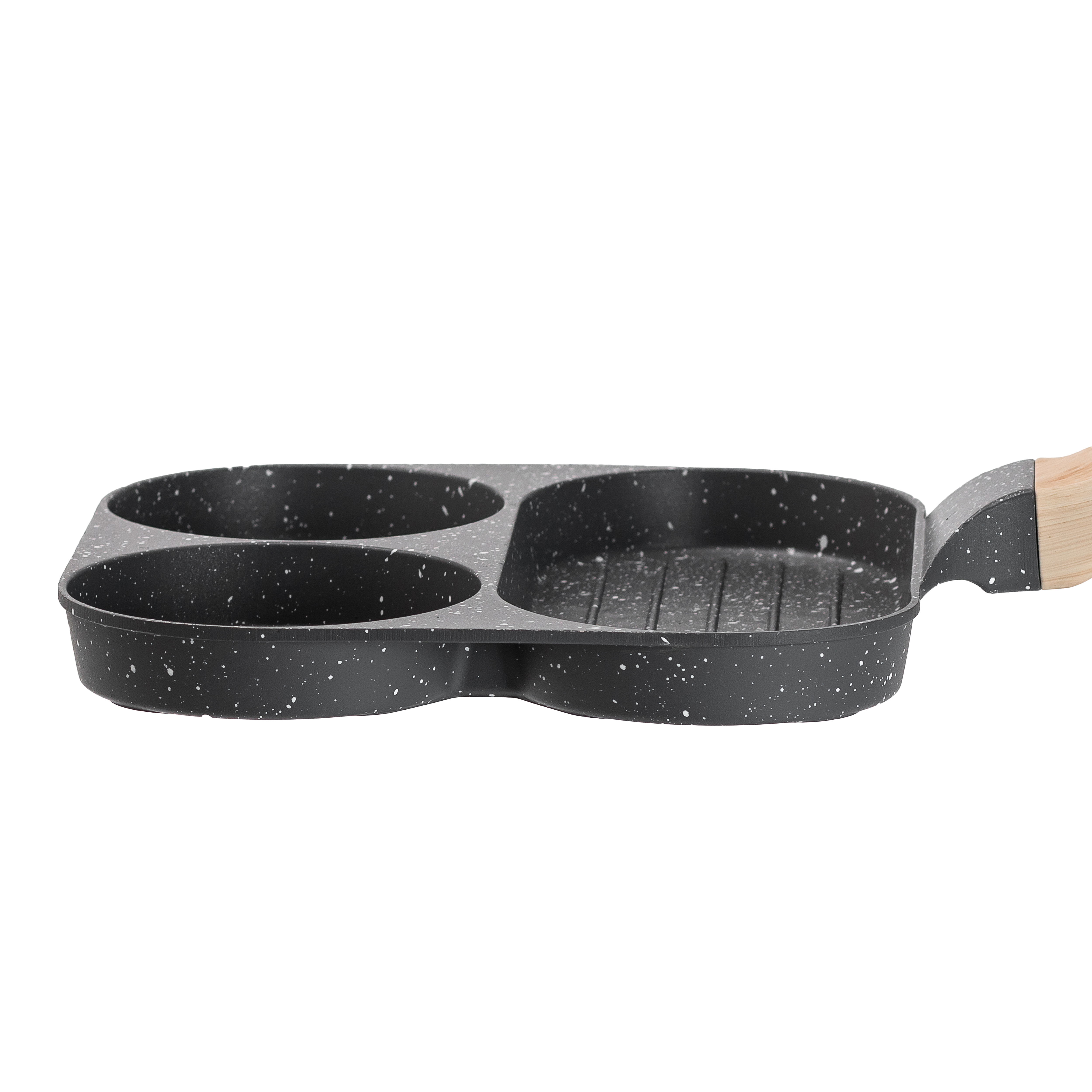 Эта компактная сковорода-гриль 3 в 1 создана для приготовления завтраков и порционных блюд. Корпус выполнен из литого алюминия, обеспечивает равномерный прогрев и хорошую теплоотдачу. Три круглые формы объёмом 120 мл идеально подходят для яичницы, мини-блинов, оладьев или мини-котлет; продолговатая рифлёная секция объёмом 220 мл позволяет приготовить стейк, рыбу или овощи с характерными полосками гриля.