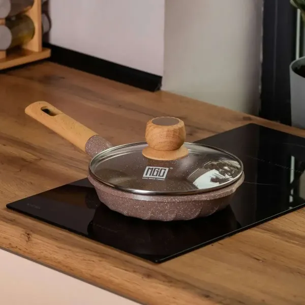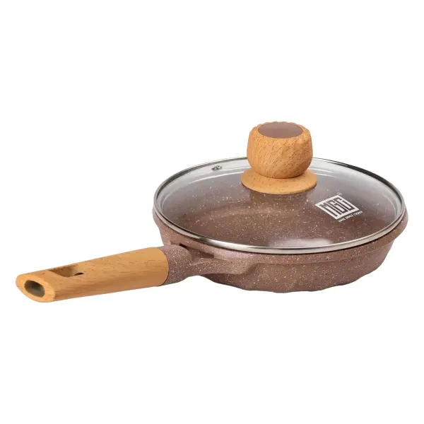 Сковорода диаметром 20 см - отличный выбор для приготовления небольших порций пищи. Посуда изготовлена из литого алюминия, хорошо проводит тепло и обеспечивает равномерное приготовление. Сковорода имеет антипригарное мраморное покрытие, благодаря чему можно готовить блюда с минимальным количеством масла, а гладкая внутренняя поверхность облегчает мытье.