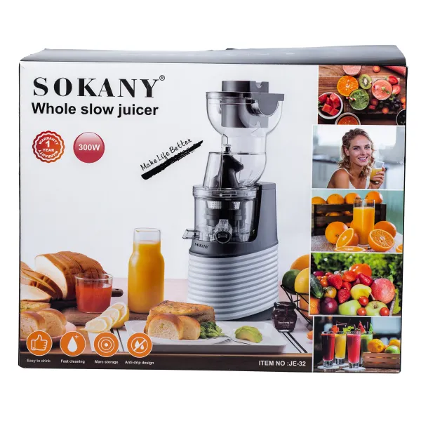 Соковыжималка Sokany JE-32 - это эффективное и удобное устройство для быстрого получения свежих соков, в частности из томатов. Мощность 300 Вт обеспечивает бесперебойный отжим сока, что делает ее идеальным выбором для домашнего использования. Односкоростная работа и функция реверса позволяют легко настроить процесс отжима, обеспечивая максимальную эффективность приготовления свежих напитков из различных фруктов и овощей.