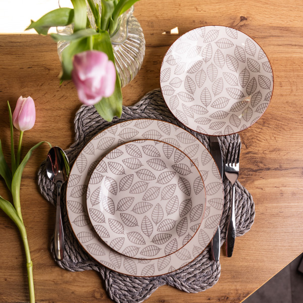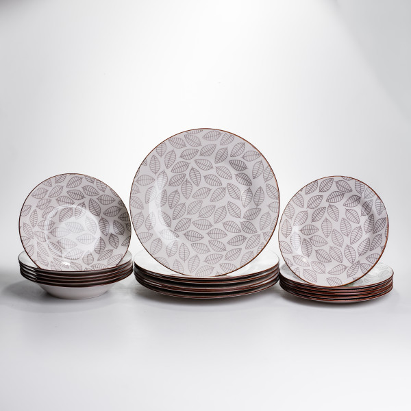 - Комплектация: 6 обеденных тарелок, 6 десертных тарелок, 6 суповых тарелок