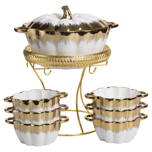 Суповый сервиз из фарфора на 8 предметов — это удобный набор для подачи первых блюд в домашних условиях или во время праздничных трапез. В комплект входят шесть порционных мисок с ручками, супница с крышкой и металлическая подставка, обеспечивающая аккуратное и эффектное размещение всех элементов. Такой набор позволяет подать блюдо сразу на шесть персон, сохраняя его тепло и эстетичный вид.